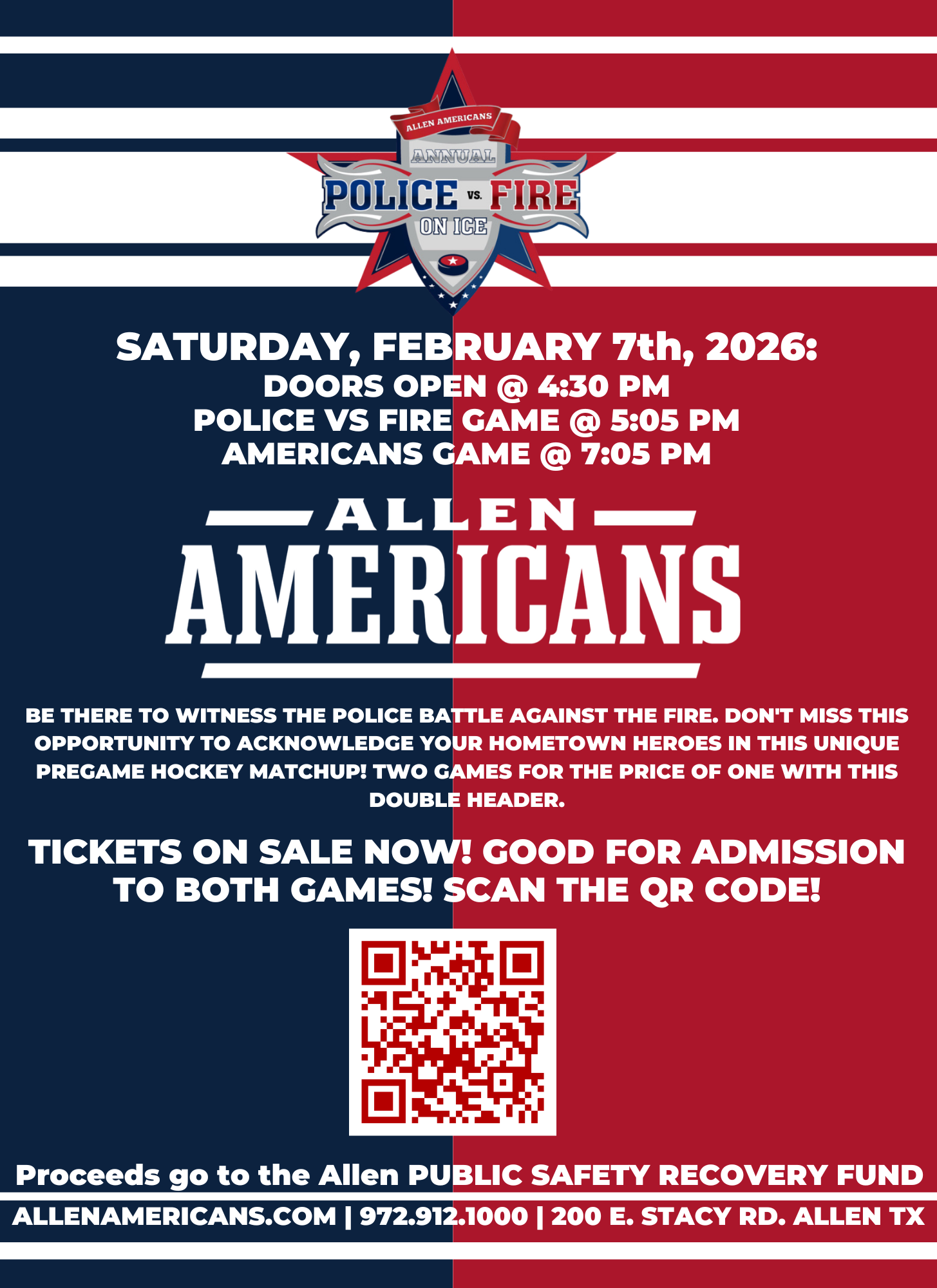 Allen PSRF Fire vs Police Annual Hockey Game Save the date for the Allen Americans Annual Police vs Fire on Ice Game. Saturday, February 07, 2026 Doors open at 4:30pm at the Credit Union of Texas Event Center in Allen. Allen Public Safety Recovery FundP.O. Box 1995Allen, TX 75013 Allen PSRF